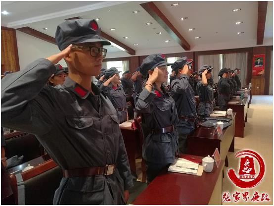 在開班儀式上,莊嚴(yán)的佩戴軍帽、授班旗儀式讓身著紅軍服的全體學(xué)員初次感受到了井岡山精神的耀眼。